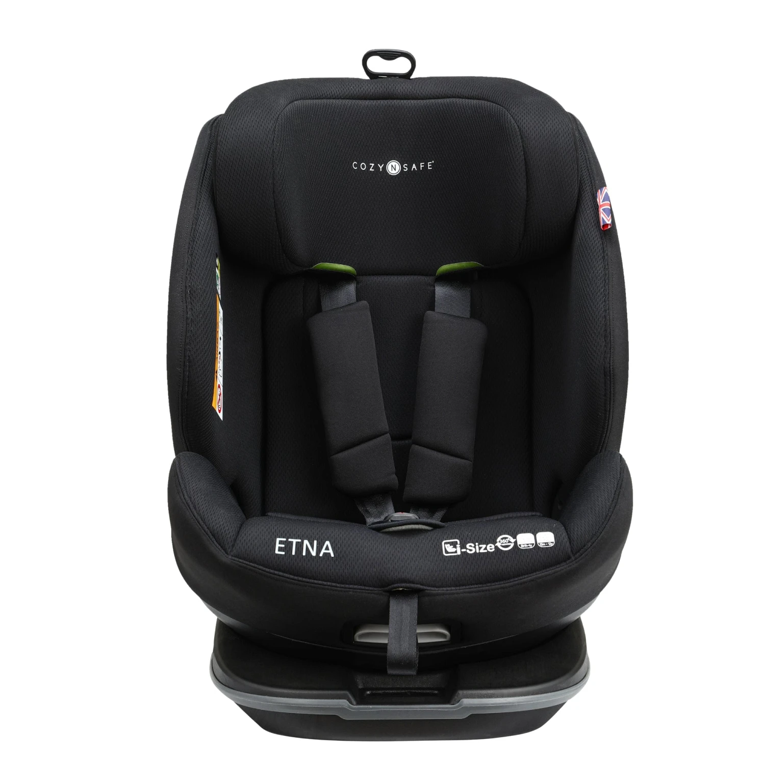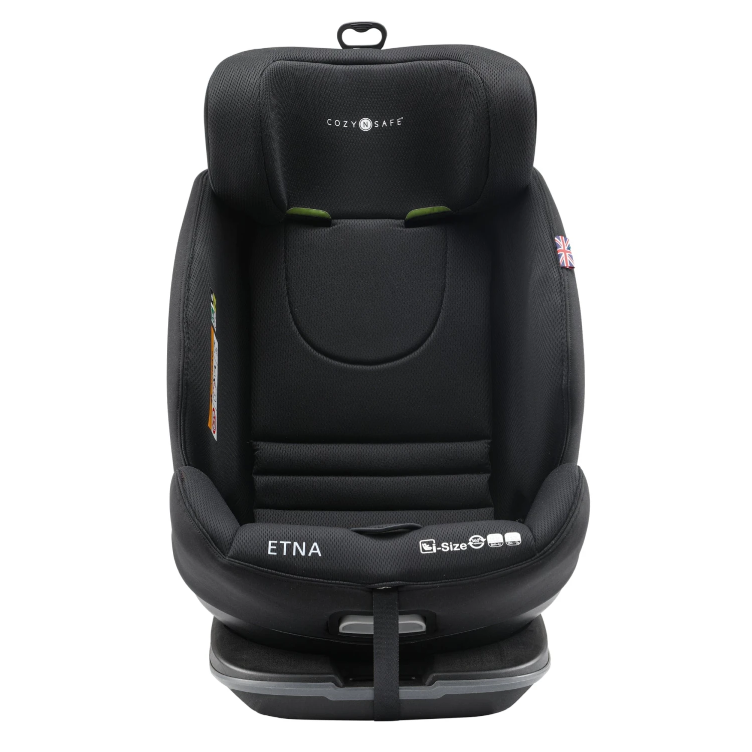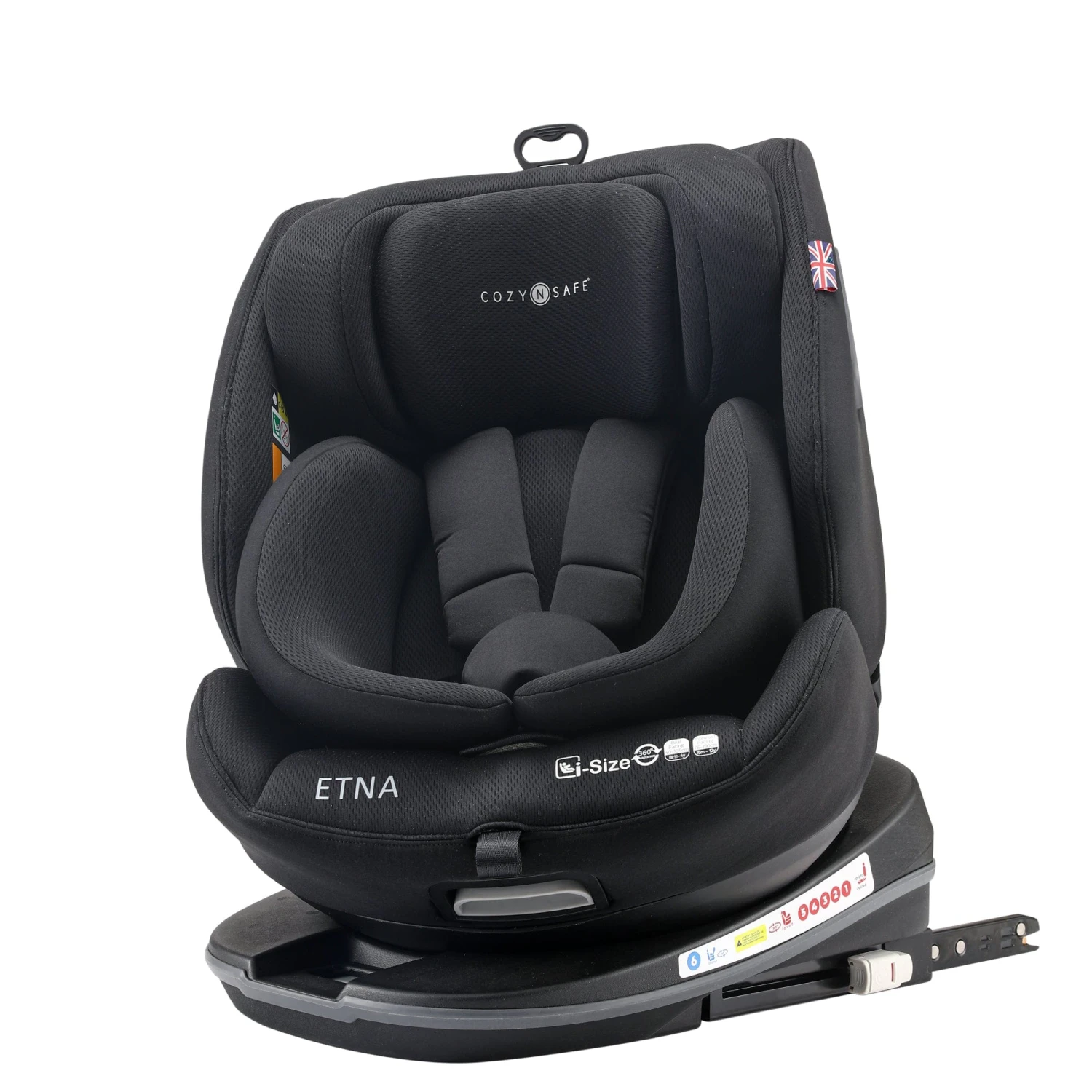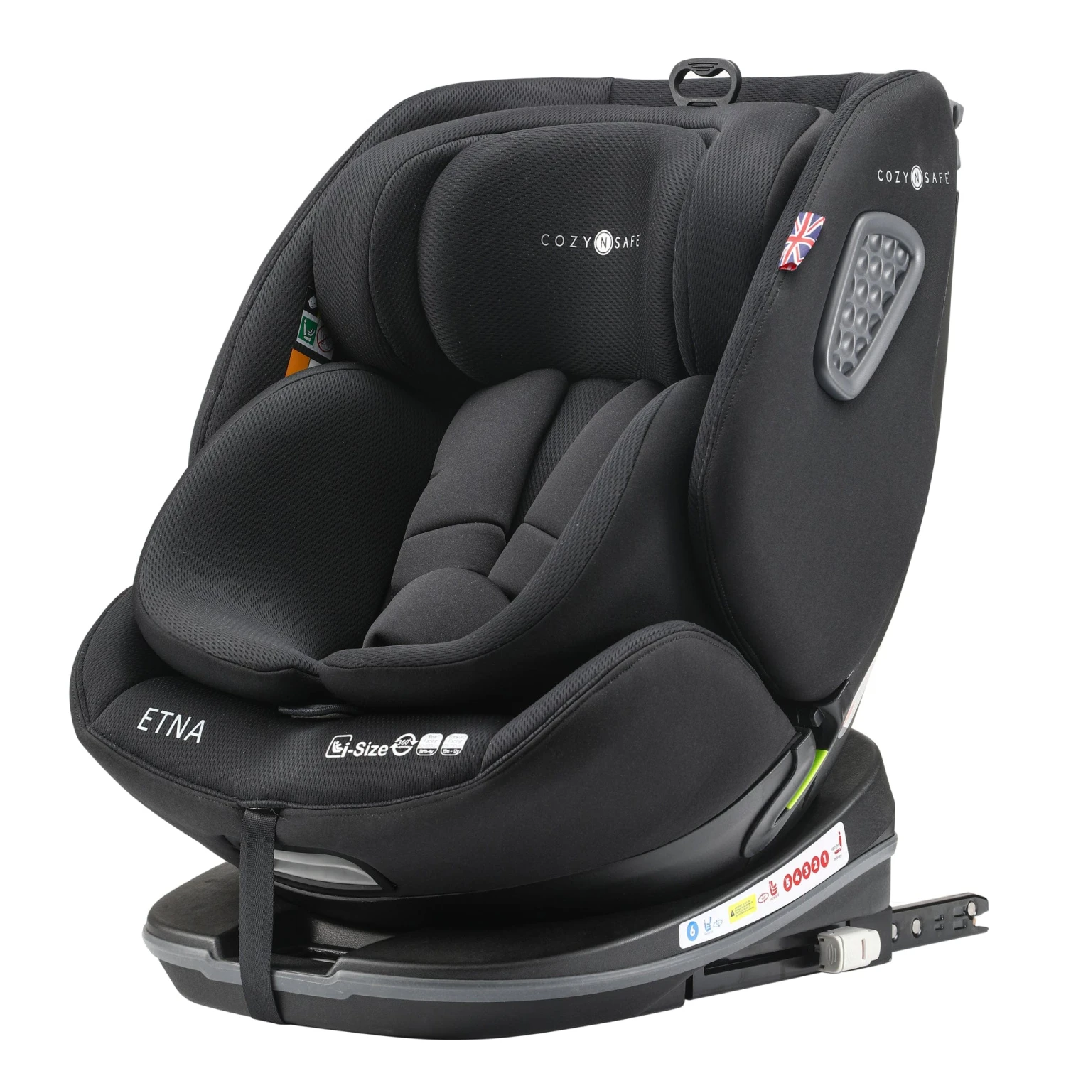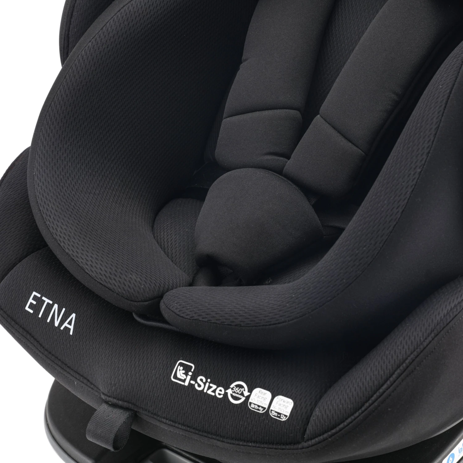 The i-Size seat is installed in most modern cars using the Isofix and Top Tether system until your toddler reaches 105cm, then simply hide the harness and the seat is installed using the vehicles’ 3-point belt. The Etna has an extended rear facing feature allowing you to rear face your baby all the way up to 105cm (approx. 4 years old.) The 360° seat which locks at 90° allows you easy access to your child when putting them in or out the car seat. No more breaking your back bending in and out of the car.