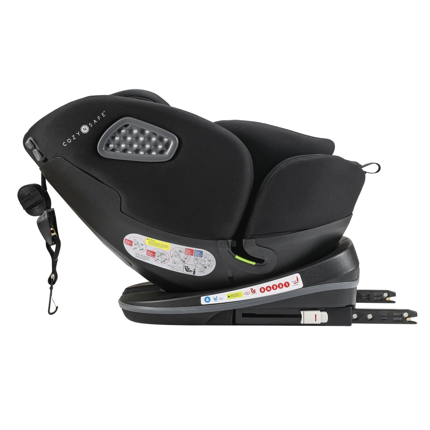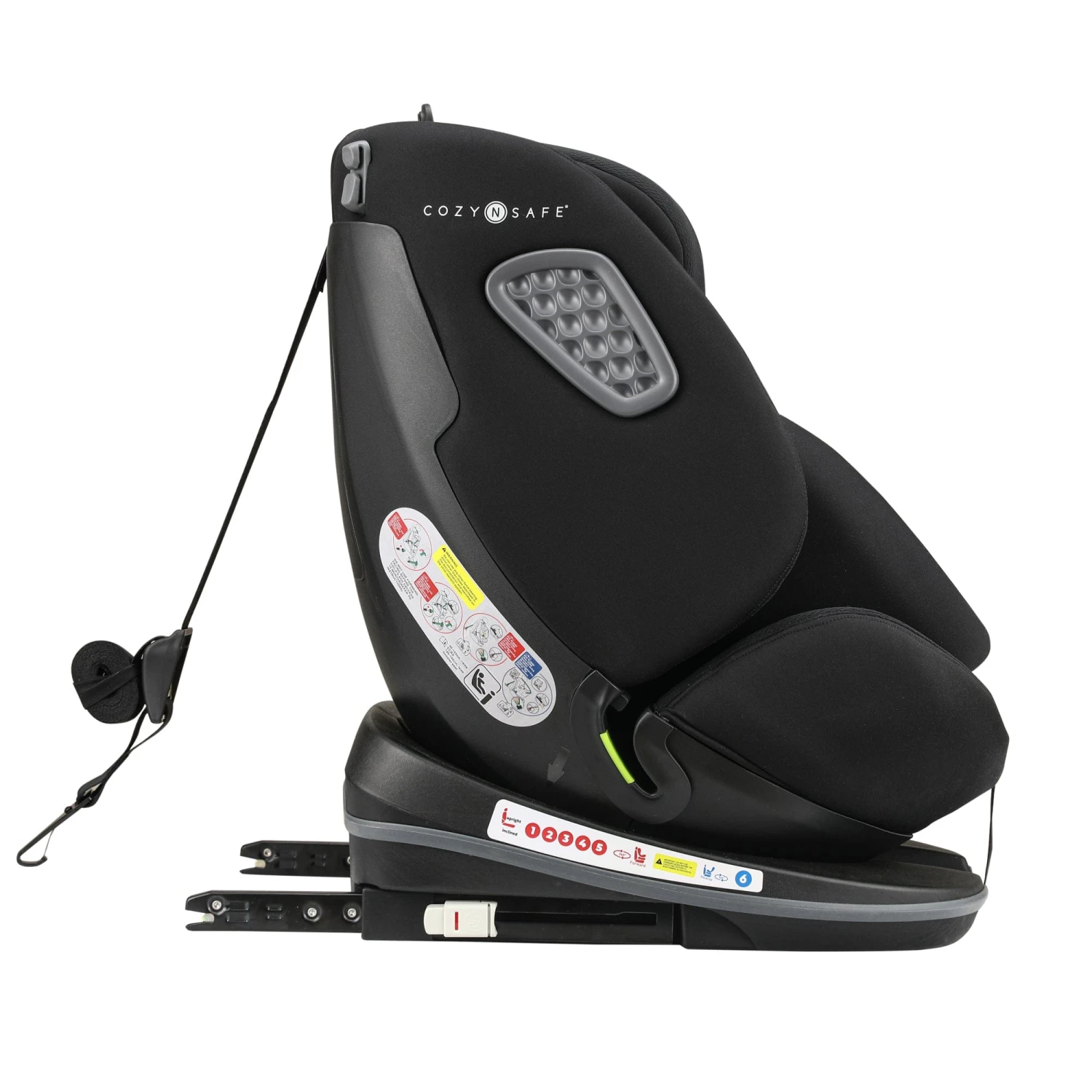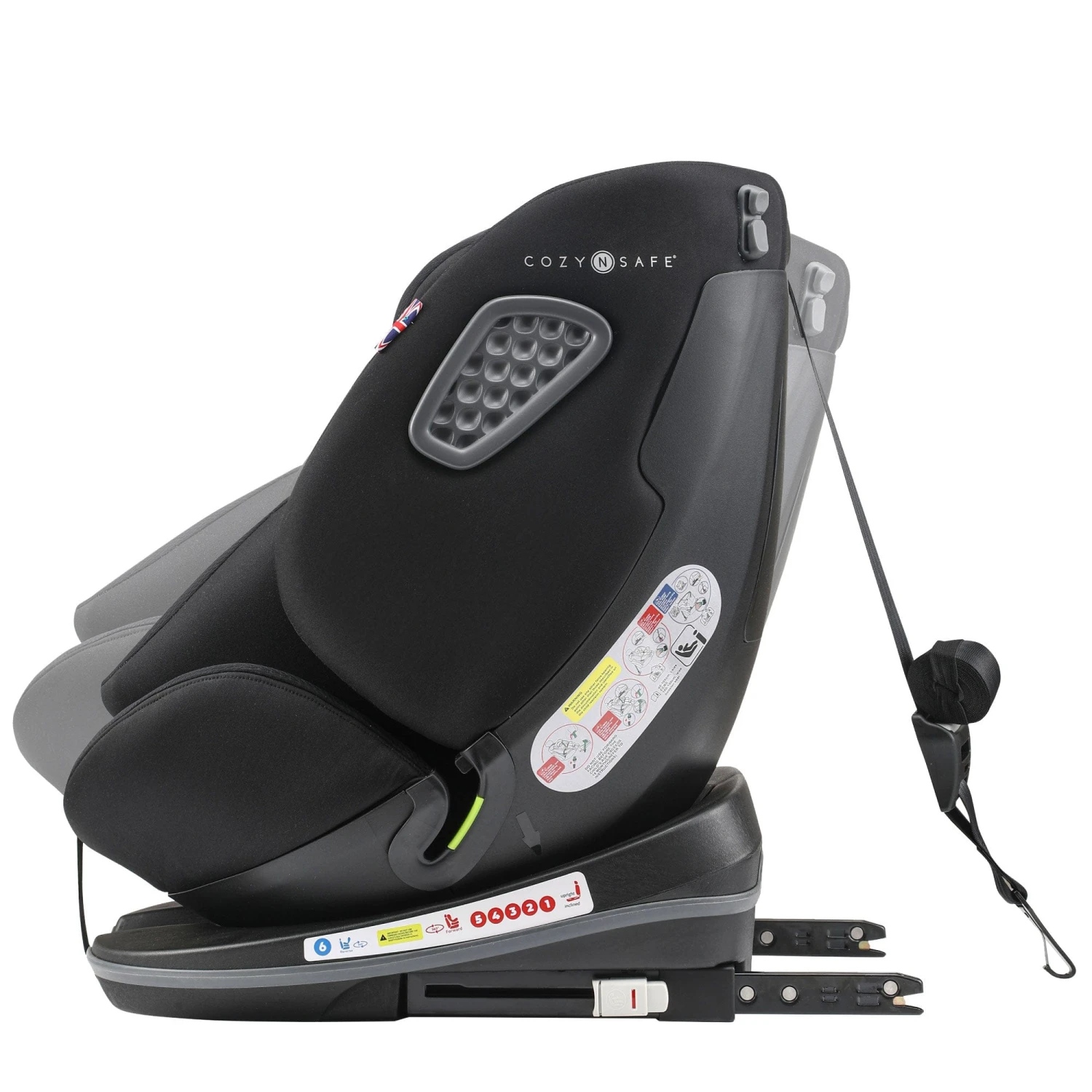 - Fitted using Isofix, top tether rear facing/ vehicle 3-point belt forward facing