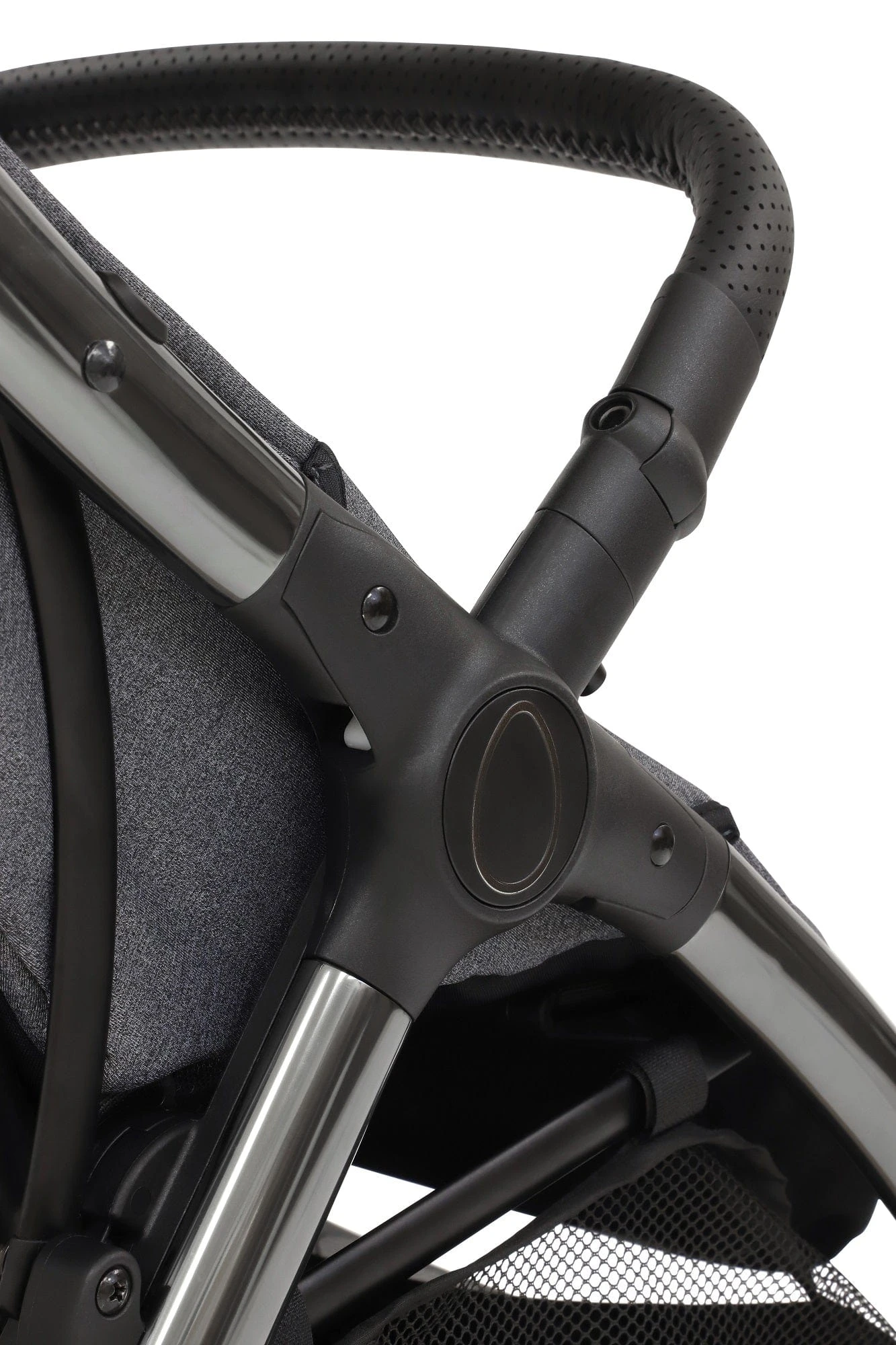 A unique curved chassis profile invites the very clever z-fold system that is at the heart of the stroller. A deceptively simple one-hand process using discrete buttons on the hand-stitched handlebar ends with a small freestanding fold. The handlebar area also houses two convenient hooks for hanging your backpack.