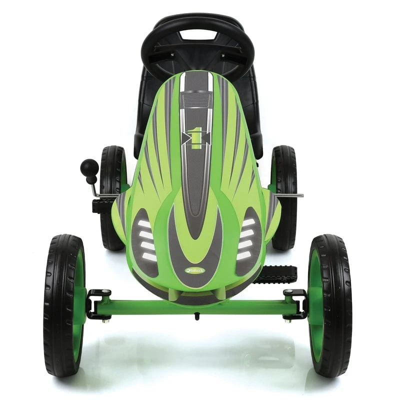 The Speedster by hauck was designed as a beginners’ pedal car. The low weight, sporty design, trendy colours and large front plate make the Speedster a full-on fun-mobile for boys and girls aged 4 and over. As well as training strength, stamina and reactions, this go-kart is a fun way to teach the rules of the road, and even reverse parking. To keep the speed under control, the easily operated handbrake works on both rear wheels for optimum safety. The bucket seat has a comfortable backrest and can be adjusted to suit the child’s leg length.