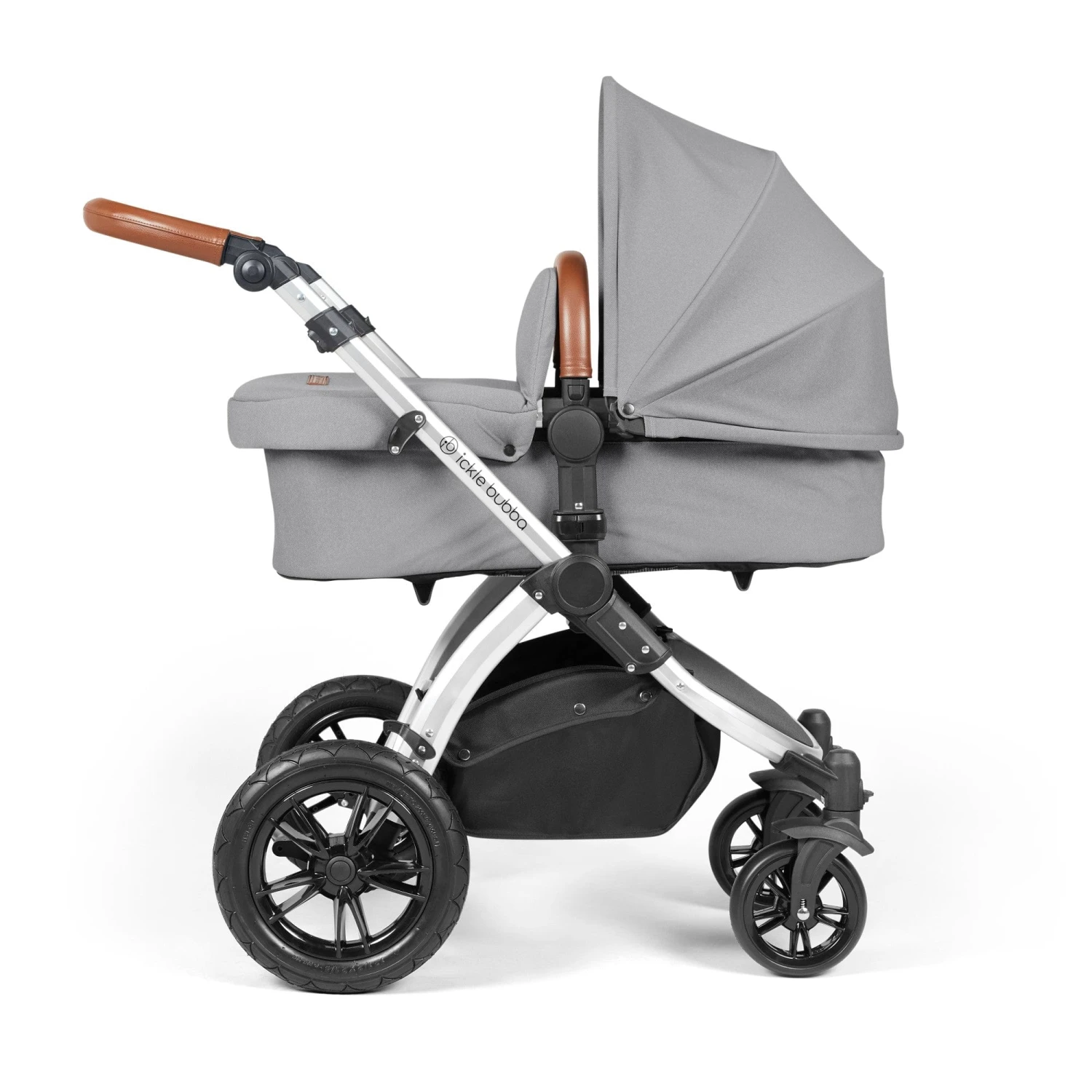 The travel system bundle includes the Stomp Luxe pushchair with seat and carrycot, Stratus i-Size car seat and ISOFIX base, car seat adapters, car sunshades, changing rucksack and mat, carrycot apron, footwarmer, seat liner and rain cover.