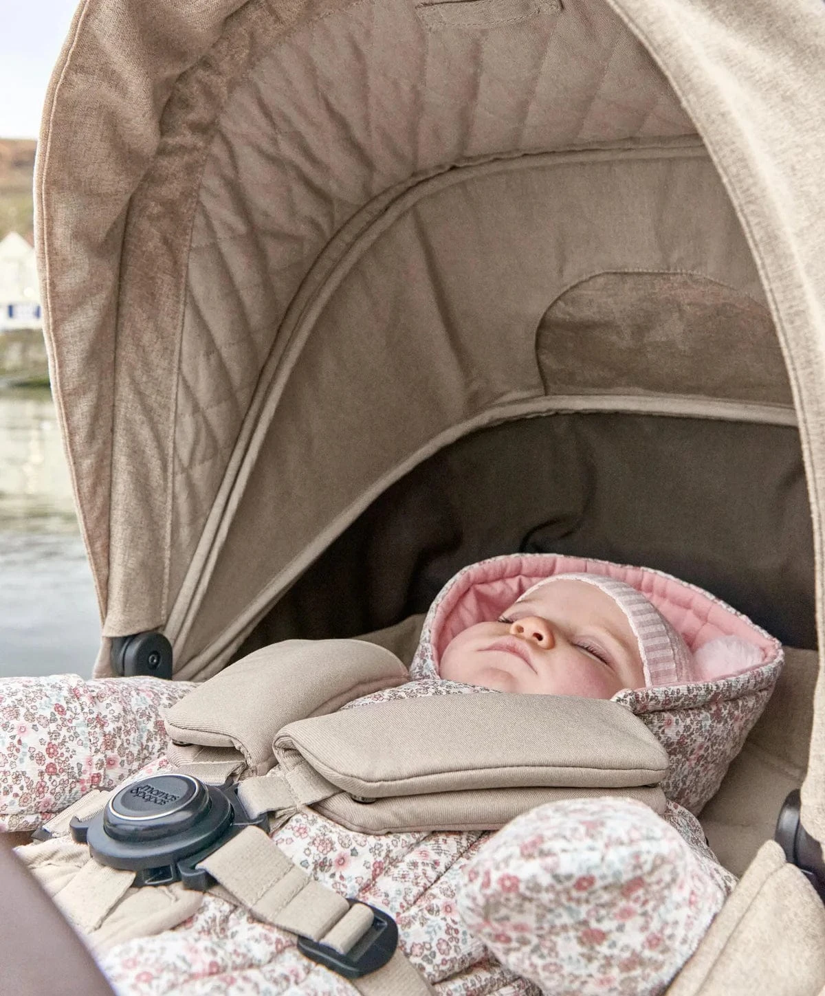 Our Pebble edition is finished with a soft taupe melange fabric and diamond quilted details, dark oak leatherette, and a dark grey chassis. The lie-back seat is suitable from birth and thanks to multi-recline positions, baby can comfortably sit up and watch the world go by, then snuggle down for a snooze when it’s naptime.